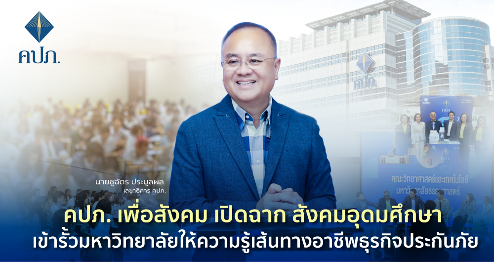 นายชูฉัตร ประมูลผล เลขาธิการคณะกรรมการกำกับและส่งเสริมการประกอบธุรกิจประกันภัย (เลขาธิการ คปภ.)เป็นประธานเปิดงาน “คปภ. เพื่อสังคม” สังคมอุดมศึกษา เมื่อวันที่ 4 พฤศจิกายน 2567 ณ คณะวิทยาศาสตร์และเทคโนโลยี มหาวิทยาลัยธรรมศาสตร์ (ศูนย์รังสิต) โดยสำนักงาน คปภ. และภาคธุรกิจประกันภัยร่วมกันลงพื้นที่เพื่อถ่ายทอดความรู้เรื่องการประกันภัยที่เกี่ยวข้องต่อสังคมเป้าหมาย และเผยแพร่เรื่องราวผ่านรายการ คปภ. เพื่อสังคม ซึ่งจะเผยแพร่ผ่านช่องทางทีวีดิจิทัล (อัมรินทีวี HD ช่อง 34) โดยมุ่งหวังให้ประชาชนผู้รับชมรายการได้รับความรู้และตระหนักถึงความสำคัญของการประกันภัย รวมทั้งเป็นการดำเนินการเพื่อสร้างประโยชน์ในมิติการส่งเสริมอาชีพตามเป้าหมายการพัฒนาที่ยั่งยืนอย่างแท้จริง โดยได้รับเกียรติจาก ผศ.ดร.ศุภชัย ศรีสุชาติ รองอธิการบดีฝ่ายบริหารทรัพยากรมนุษย์ และรศ.ดร.สุเพชร จิรขจรกุล คณบดีคณะวิทยาศาสตร์และเทคโนโลยี ให้การต้อนรับ