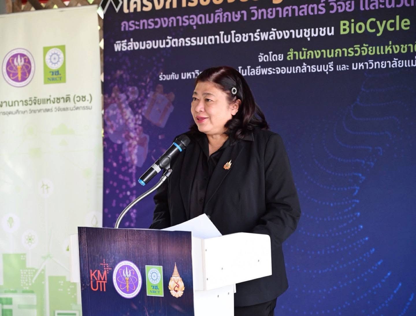 ดร.วิภารัตน์ ดีอ่อง ผู้อำนวยการสำนักงานการวิจัยแห่งชาติ กล่าวว่า อว.ได้ให้ความสำคัญกับการนำนวัตกรรมสู่การใช้ประโยชน์ ซึ่งโครงการของขวัญปีใหม่ อว.2569 วช.ได้นำนวัตกรรมเตาไบโอชาร์พลังงานชุมชน BioCycle Kiln เป็นผลงานที่ วช. ให้การสนับสนุนแก่มหาวิทยาลัยเทคโนโลยีพระจอมเกล้าธนบุรี ร่วมกับมหาวิทยาลัยแม่ฟ้าหลวง นำองค์ความรู้จากงานวิจัยมาพัฒนาเพื่อตอบโจทย์การจัดการเศษวัสดุเหลือทิ้งทางการเกษตรให้เกิดประโยชน์ ควบคู่กับการช่วยลดปัญหามลพิษทางอากาศ ฝุ่นละอองขนาดเล็ก PM2.5 และลดผลกระทบต่อสุขภาพของประชาชน ทั้งนี้ งานวิจัยและนวัตกรรมในการพัฒนาชุมชนอย่างยั่งยืน ถือเป็นโอกาสอันดีในการส่งมอบเป็นของขวัญปีใหม่ให้กับประชาชน ภายใต้โครงการของขวัญปีใหม่ อว. 2569