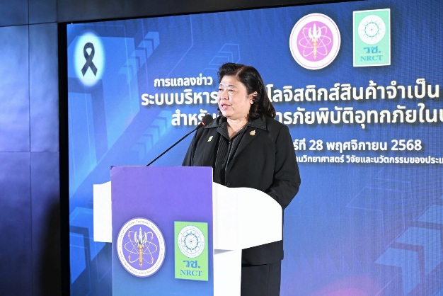 วันที่ 28 พฤศจิกายน 2568 สำนักงานการวิจัยแห่งชาติ (วช.) กระทรวงการอุดมศึกษา วิทยาศาสตร์ วิจัยและนวัตกรรม จัดการแถลงข่าว “ระบบบริหารจัดการโลจิสติกส์สินค้าจำเป็นและยาเวชภัณฑ์สำหรับการจัดการภัยพิบัติอุทกภัยในประเทศไทย” โดย ดร.วิภารัตน์ ดีอ่อง ผู้อำนวยการสำนักงานการวิจัยแห่งชาติ เป็นประธานในพิธี ณ ศูนย์ข้อมูลสารสนเทศกลางด้านวิทยาศาสตร์ วิจัยและนวัตกรรมของประเทศ อาคาร วช. 8